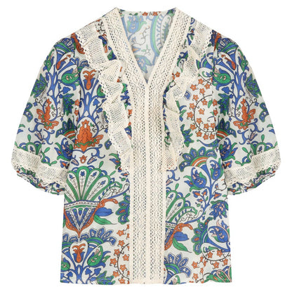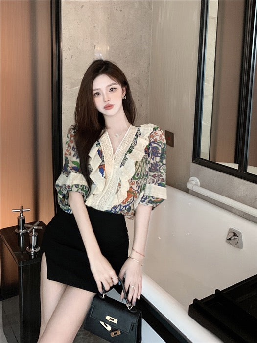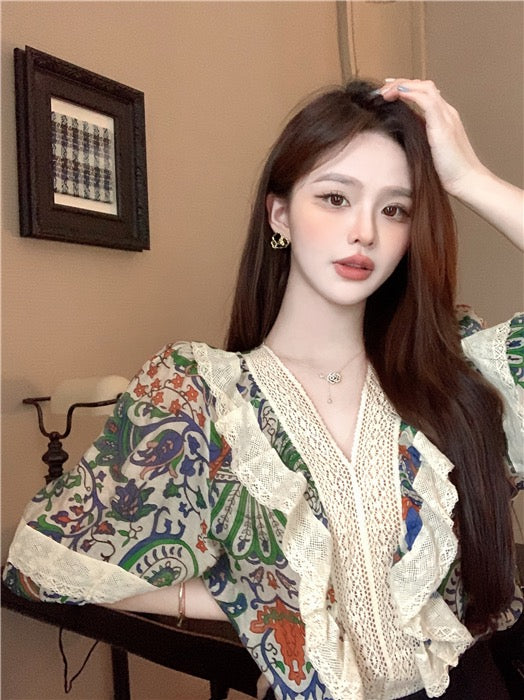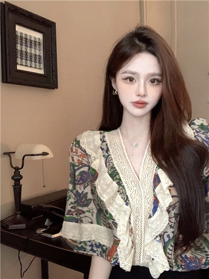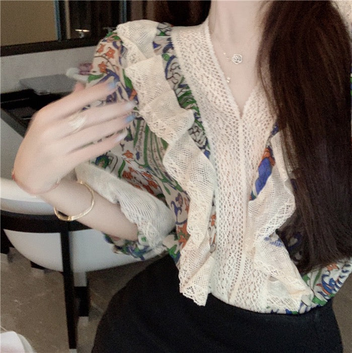 Sweet ruffled long-sleeved shirt women's spring age-reducing lace stitching v-neck design niche shirt top