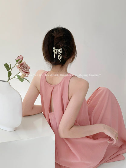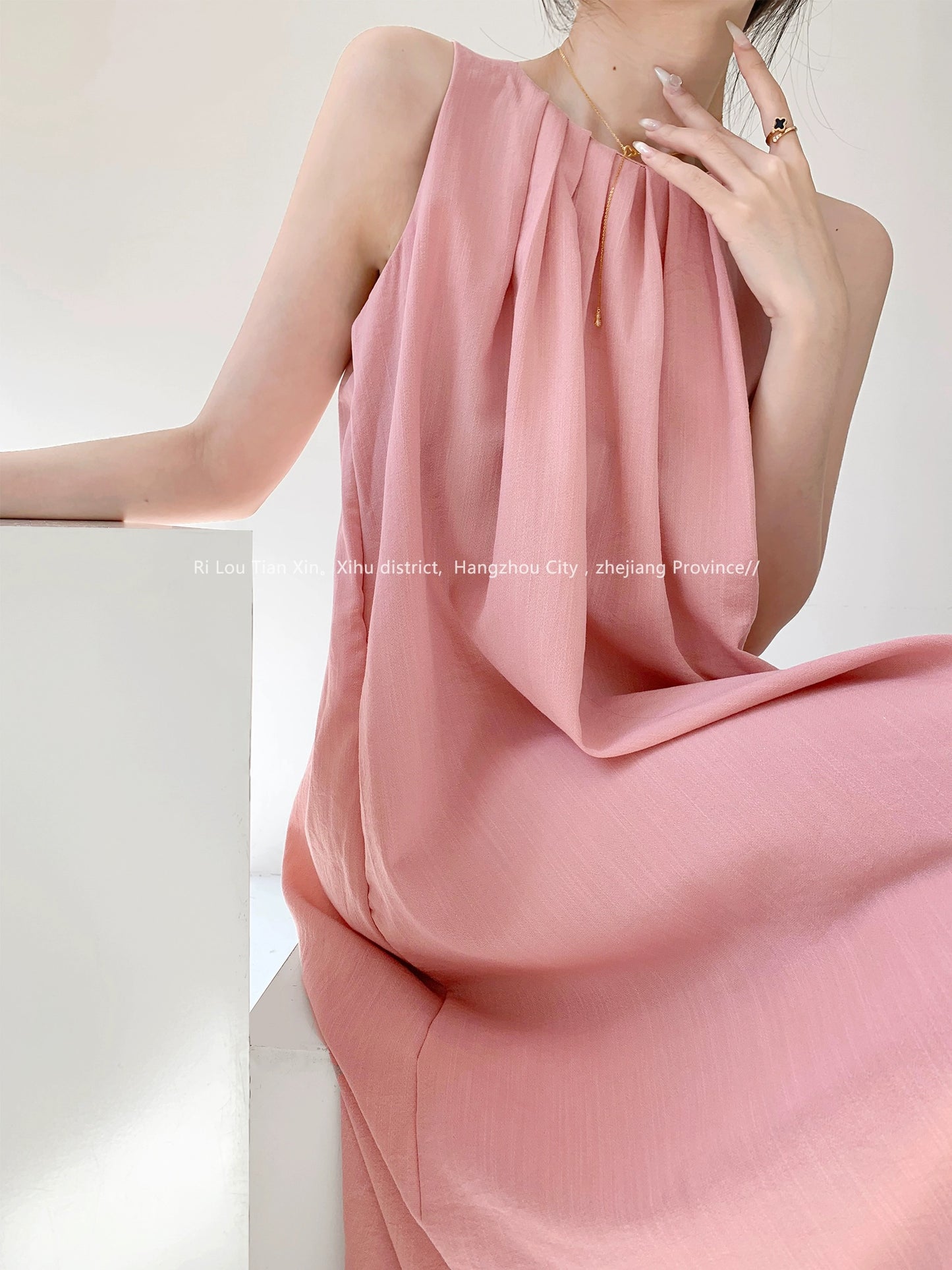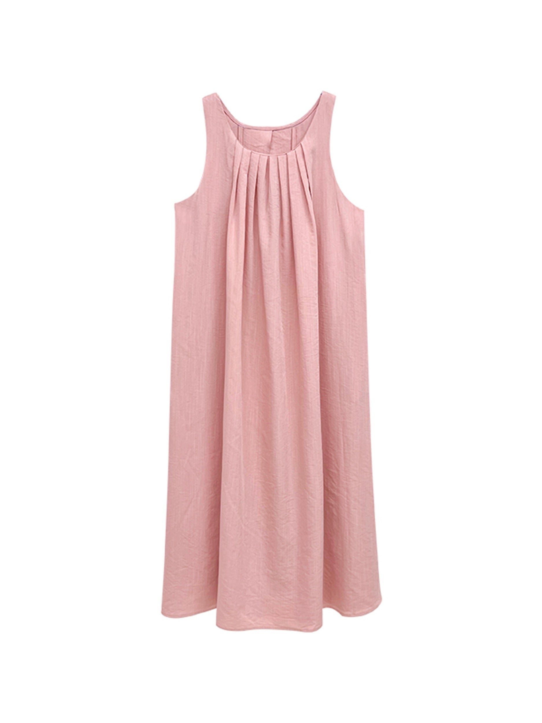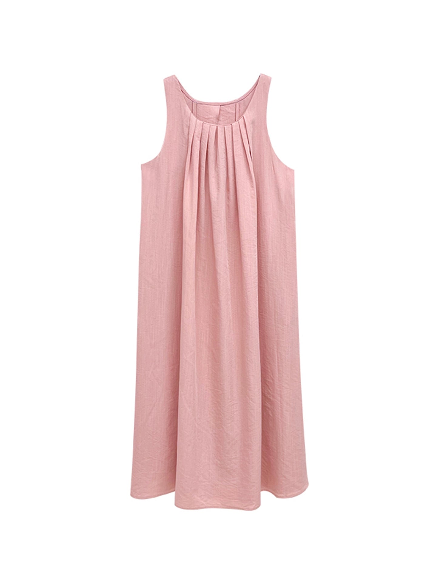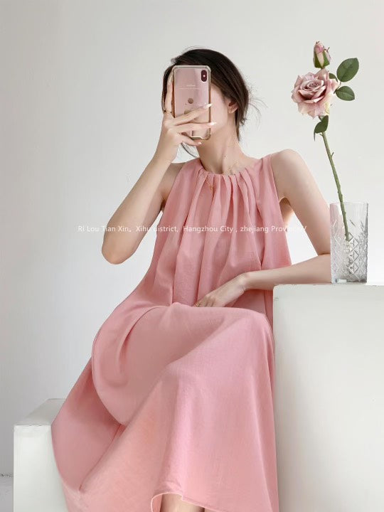 Sweet Summer Textured Linen Sleeveless Dress Women's Summer Round Neck Loose Casual Slim Pinch Suspender Skirt