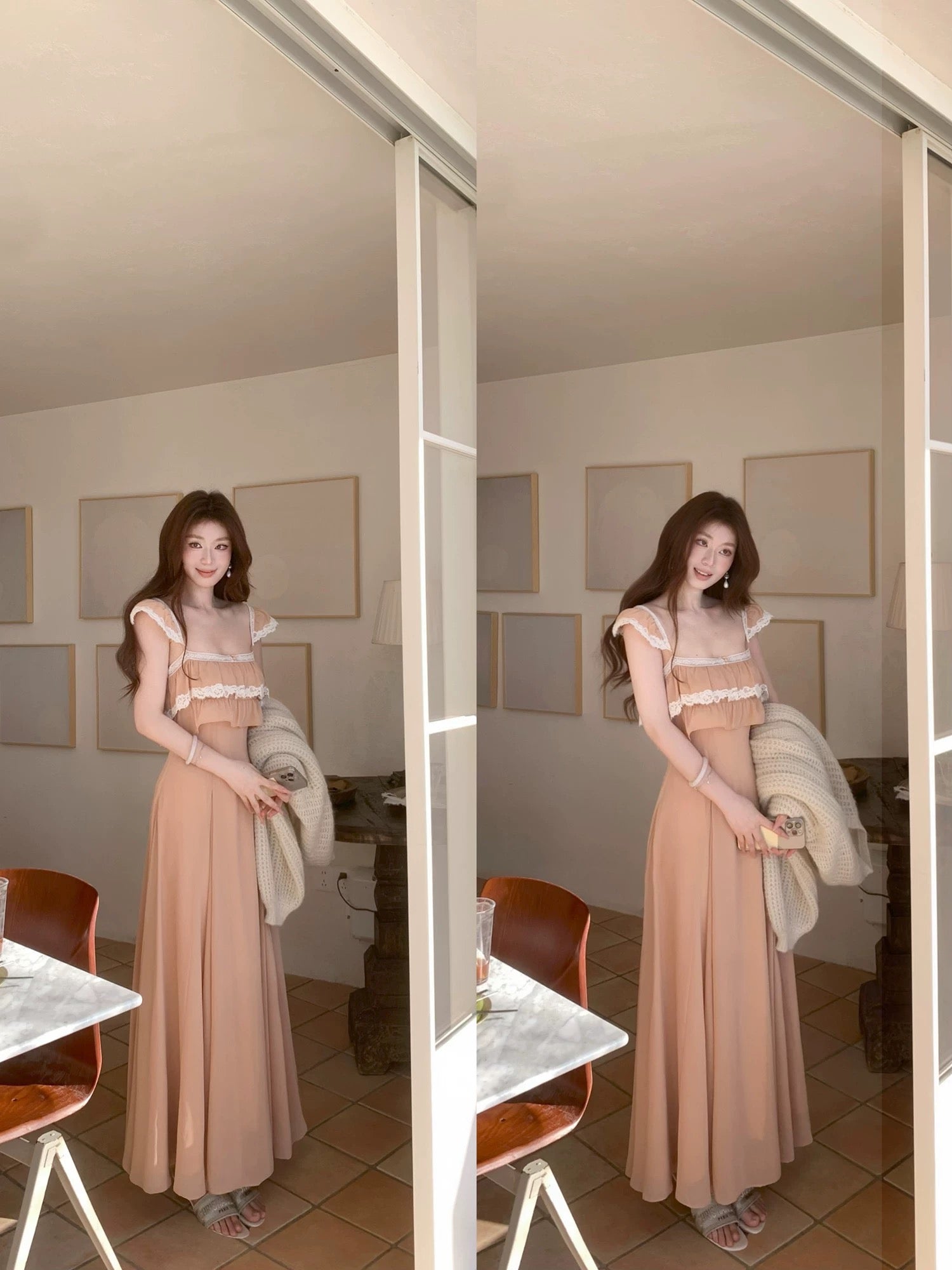 SYA Xi Xiaoxi Pink Lace French Ruffled Spaghetti Strap Dress Women's Spring Short Sleeve Vacation Style Long Dress