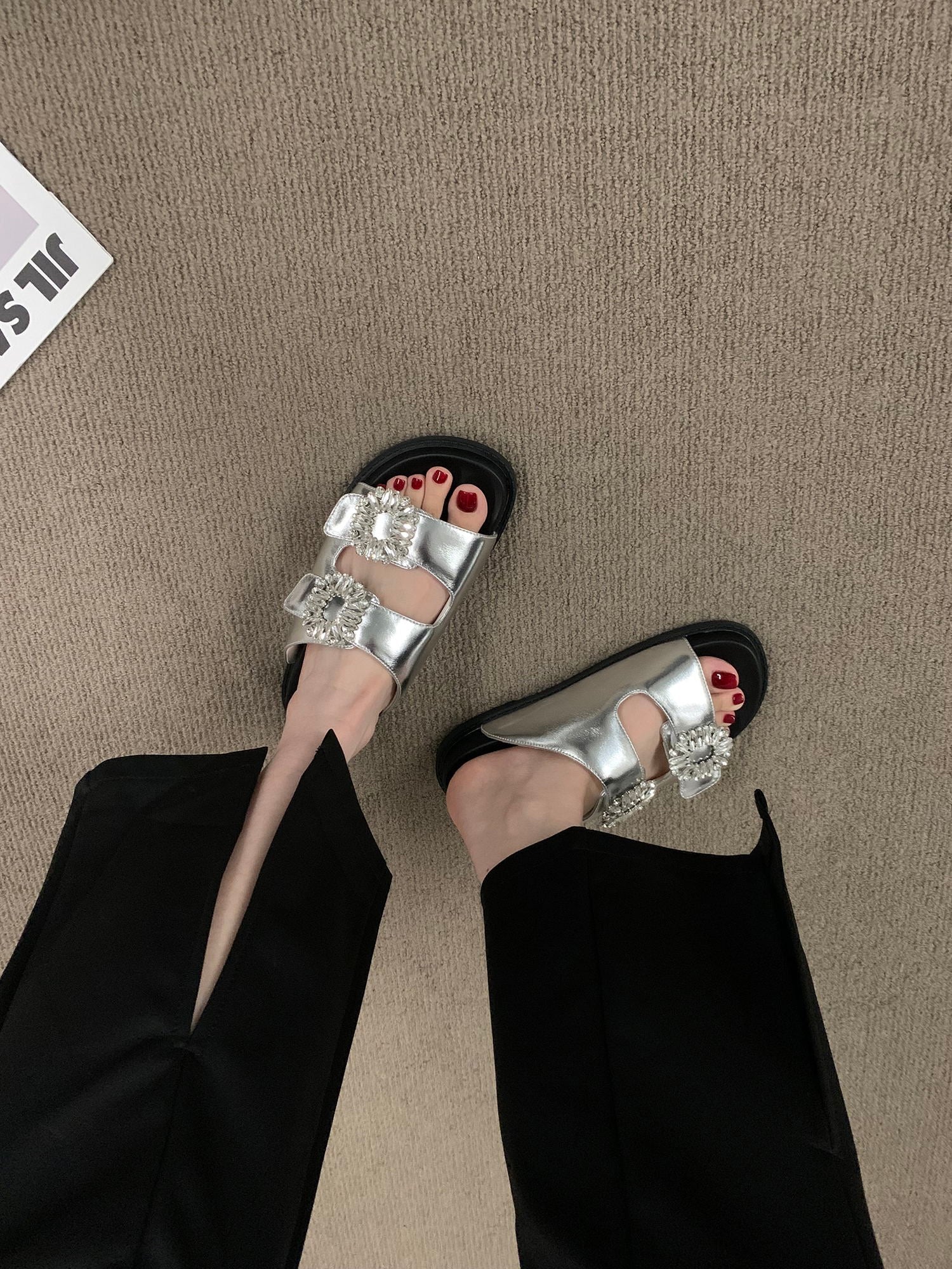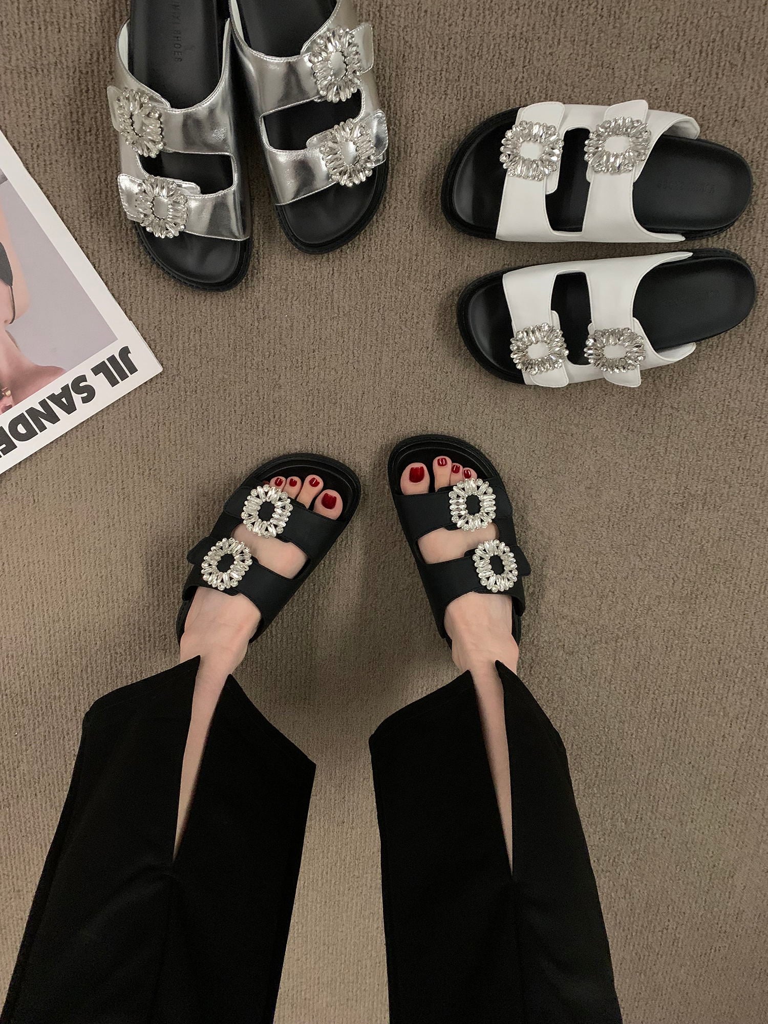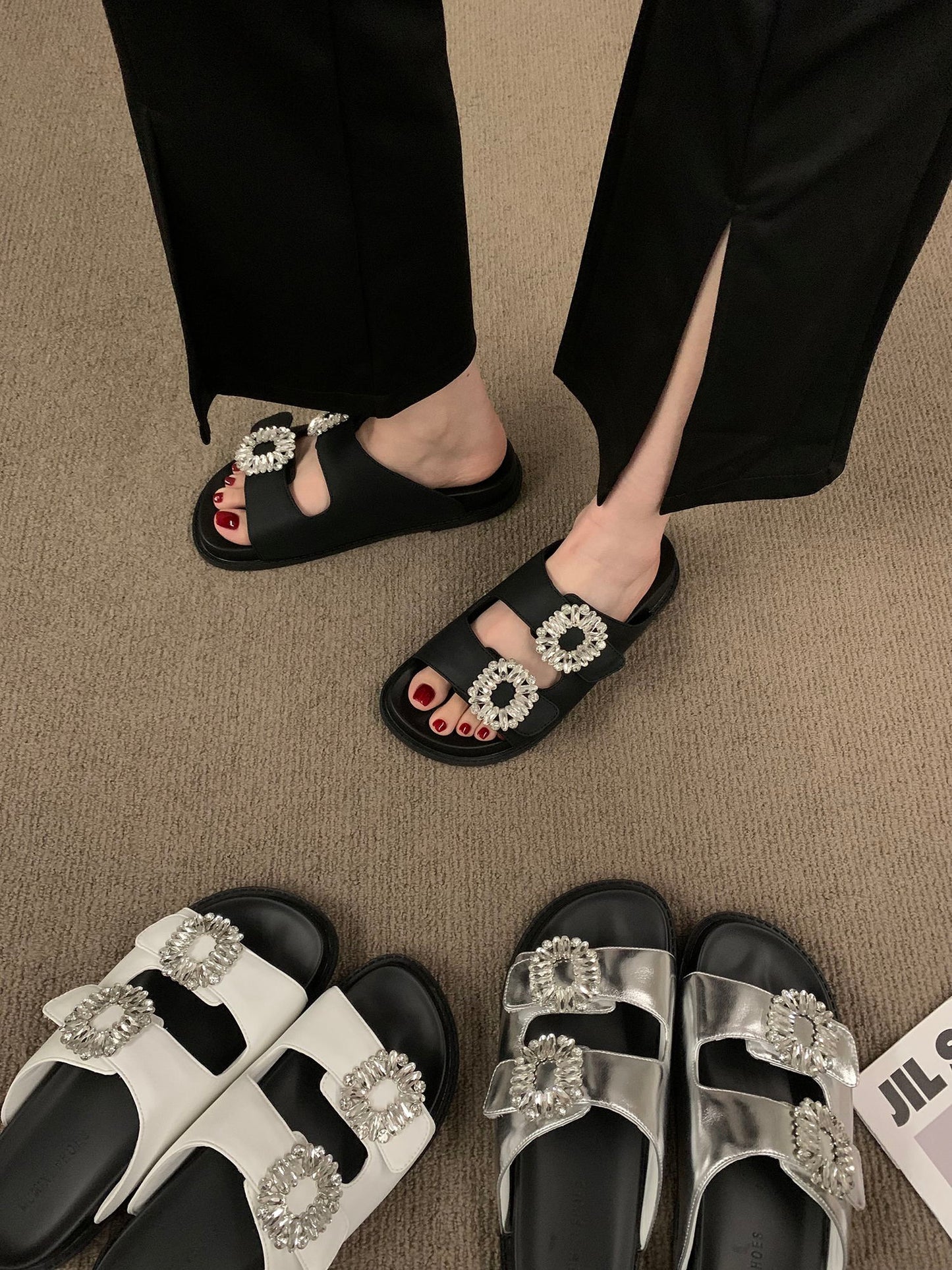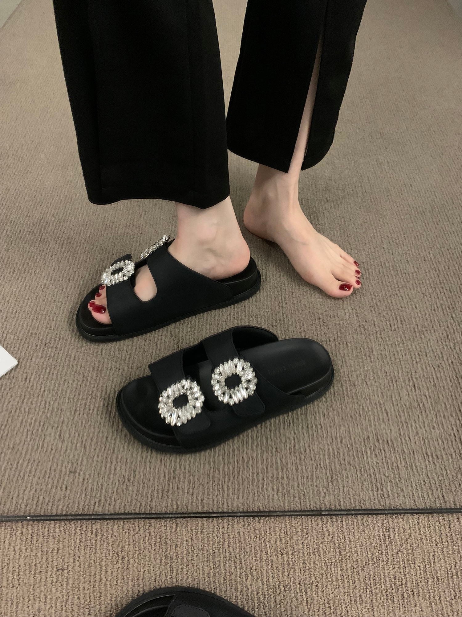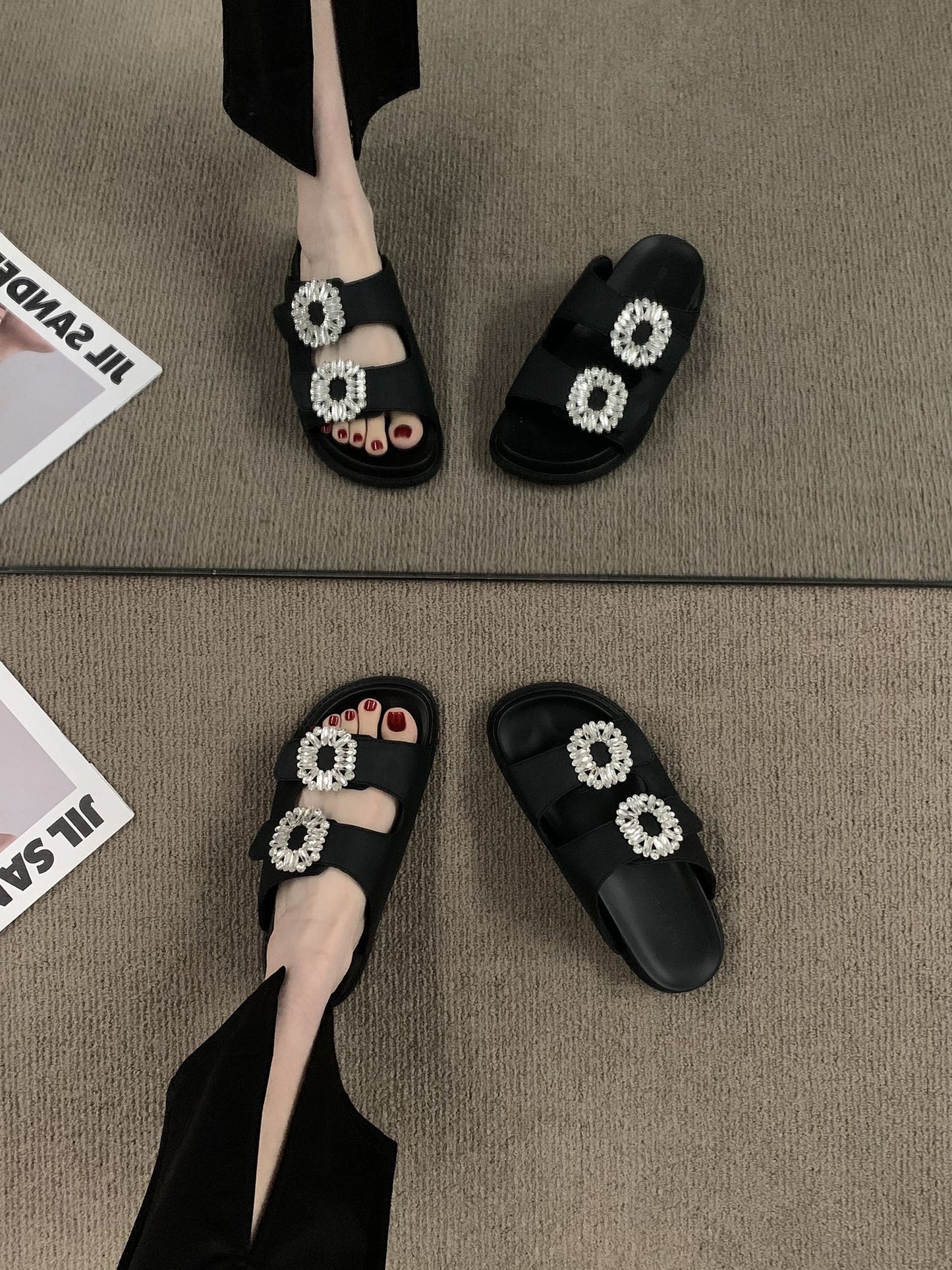 Thick-soled niche black rhinestone slippers women's shoes 2023 new summer outer wear evening wind holiday sandals sandals