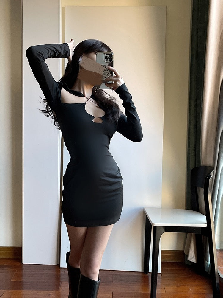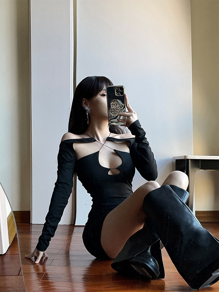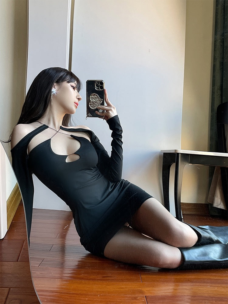 Uli Do Hepburn style sexy hollow black dress hot girl design off-shoulder long-sleeved slim-fit hip skirt