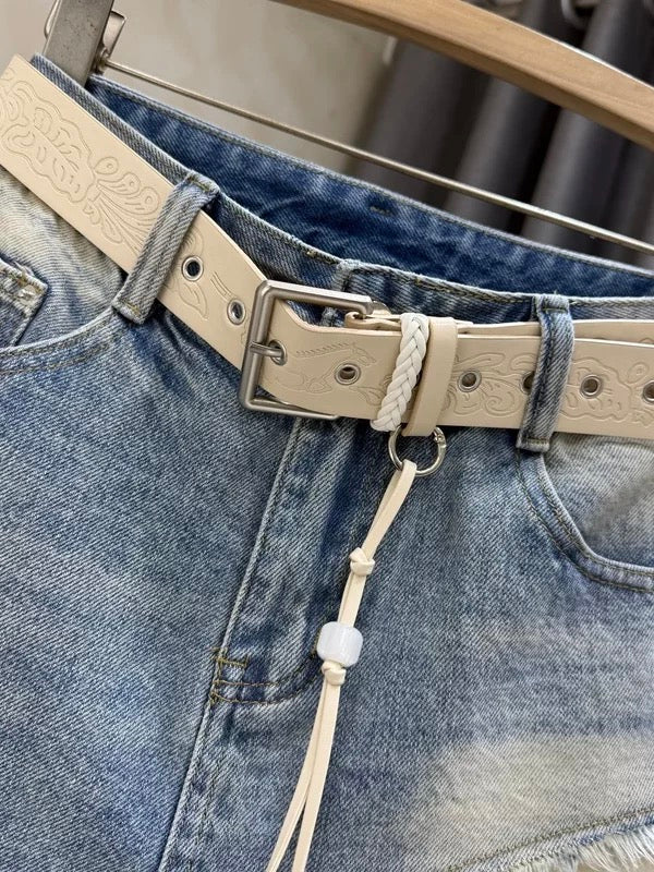 Unique design, asymmetrical denim midi skirt, high-waisted, lace-trimmed, fashionable and trendy short skirt.
