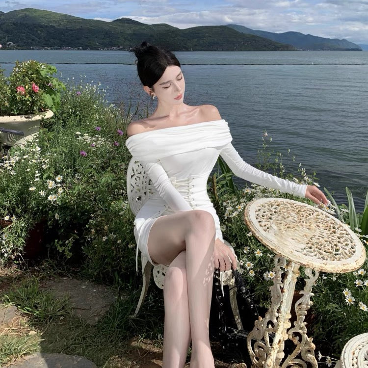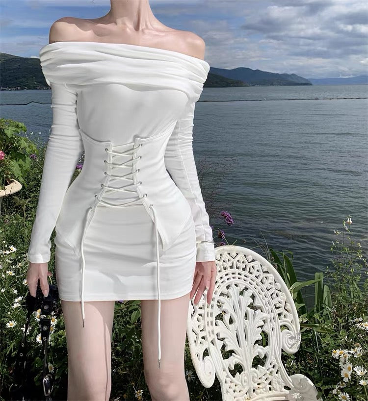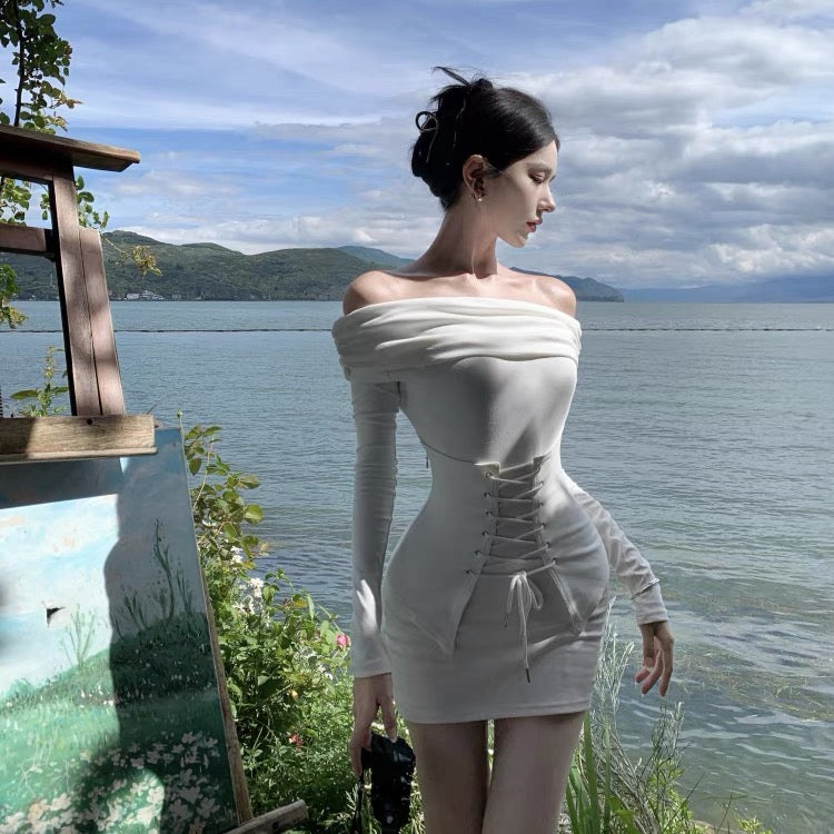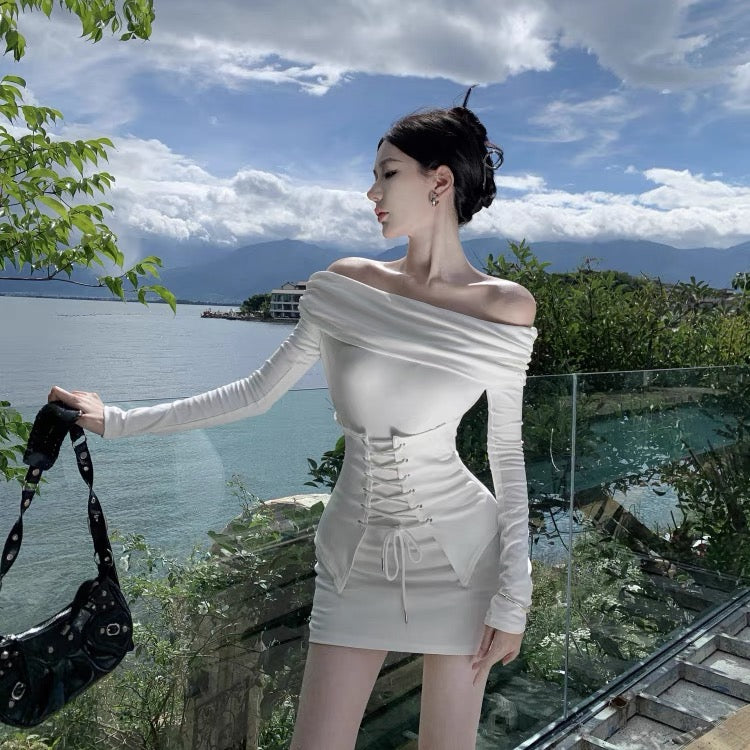 Waist-cinching sweet and spicy dress for women autumn new long-sleeved slimming off-shoulder hip skirt white short skirt A2262