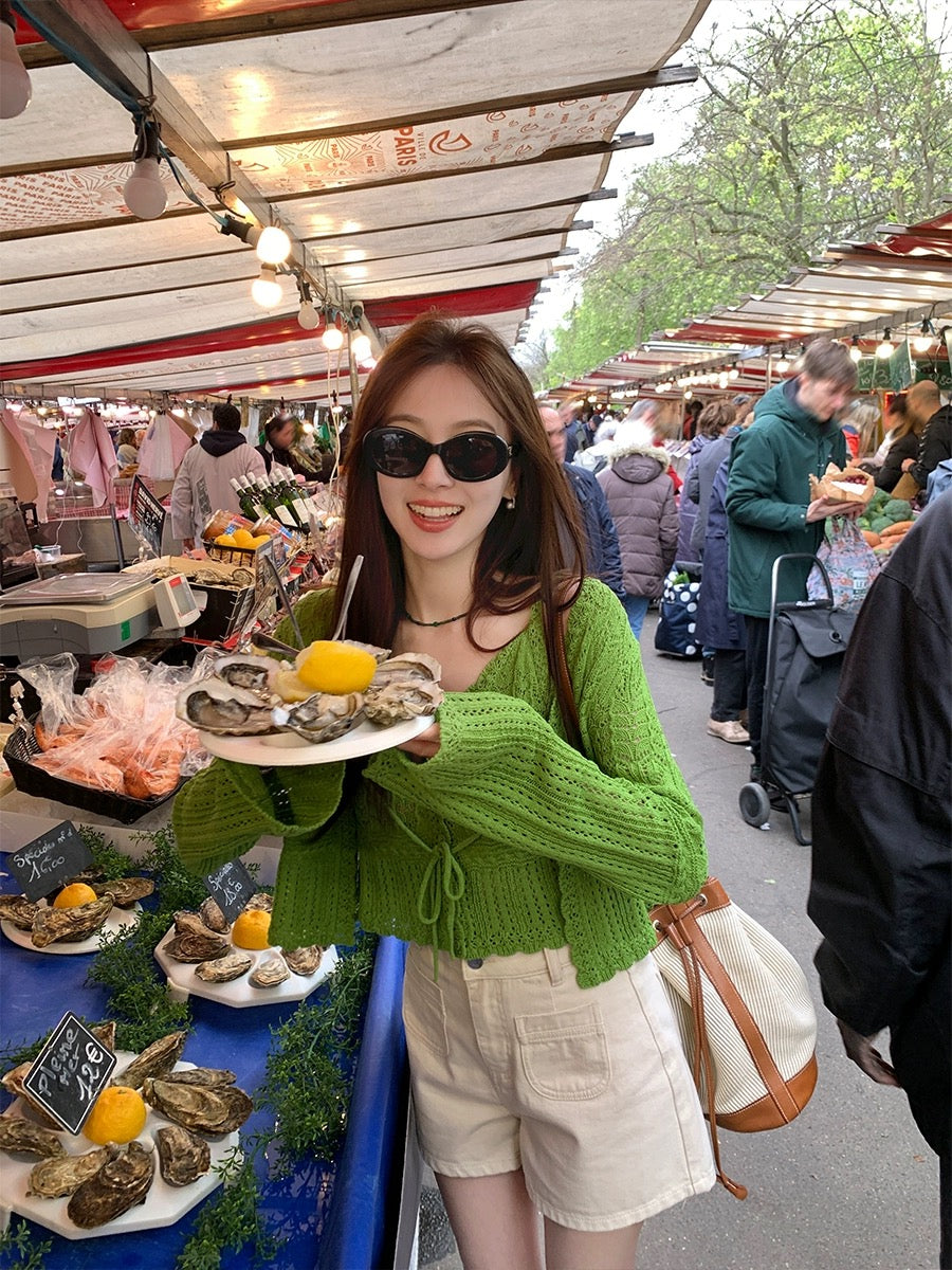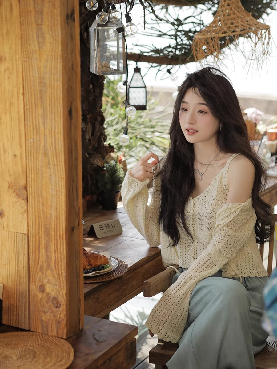 Xia Shiwen Wilderness Forest Hollow Jacquard V-neck Short Knitted Suit Suspender/Tie Cardigan Retro Women's Summer