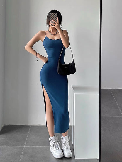 YoungGirlDay European and American sexy slim and thin shoulder straps high slit long bag hip suspender dress